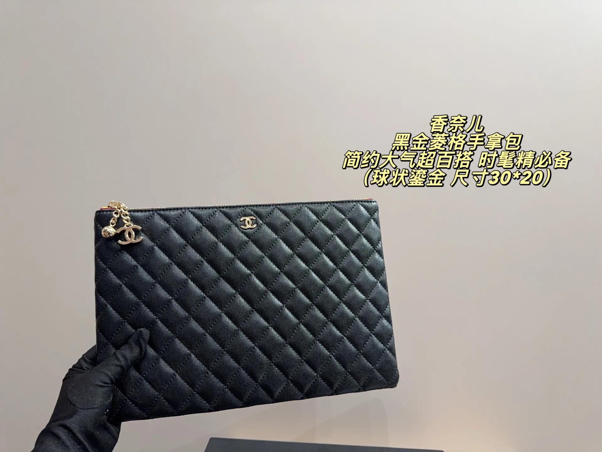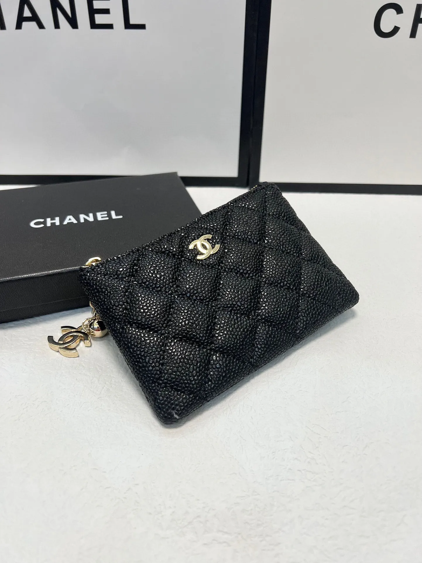 Chanel SIZE: 15x10 cm, made with caviar leather.