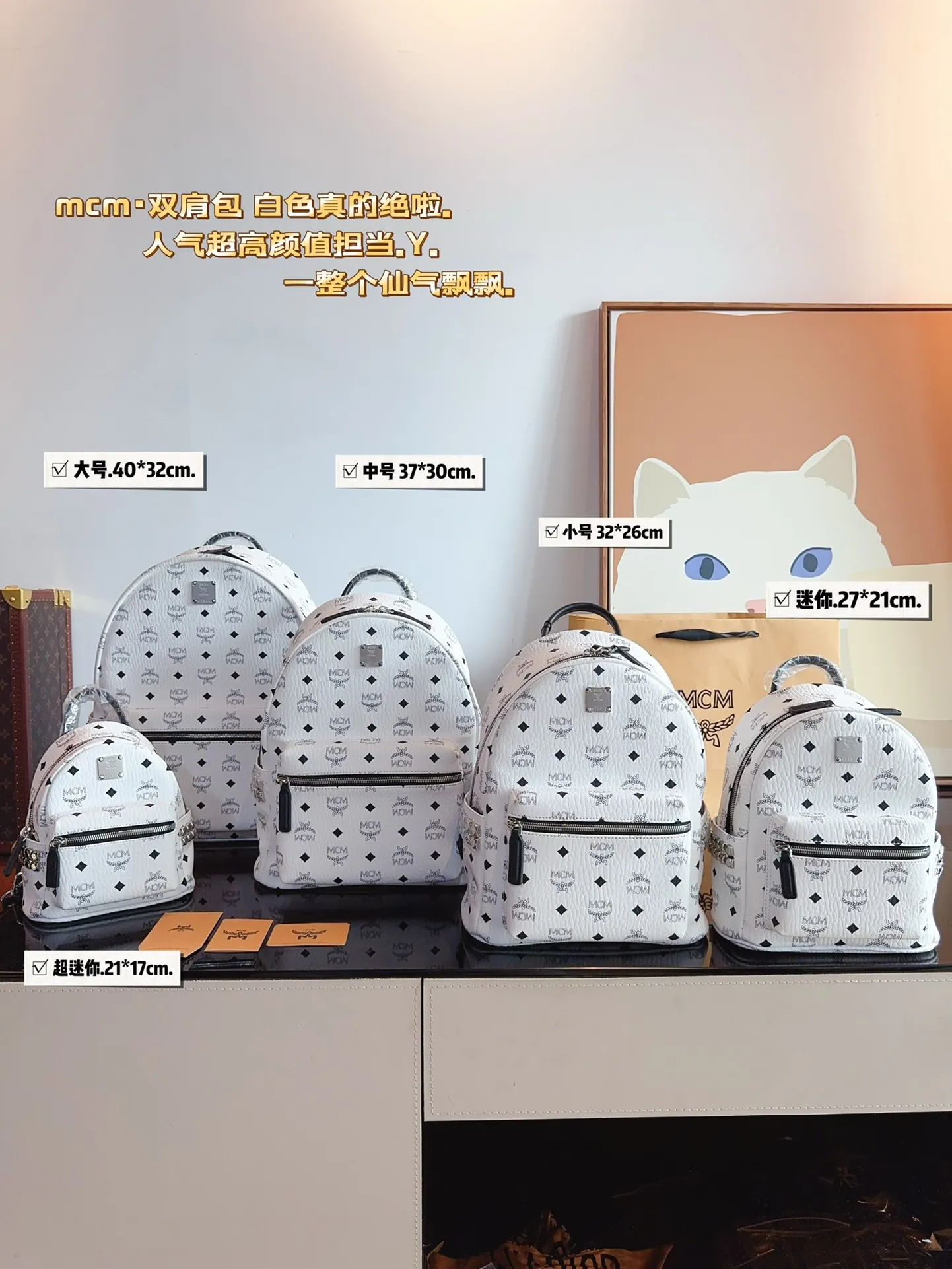 MCM Backpack Sizes: Large 40*14*32cm / Small 37*13*30cm / Small 32*12*26cm / Mini 27*10*21cm / Super Mini 21*9*17cm / 01