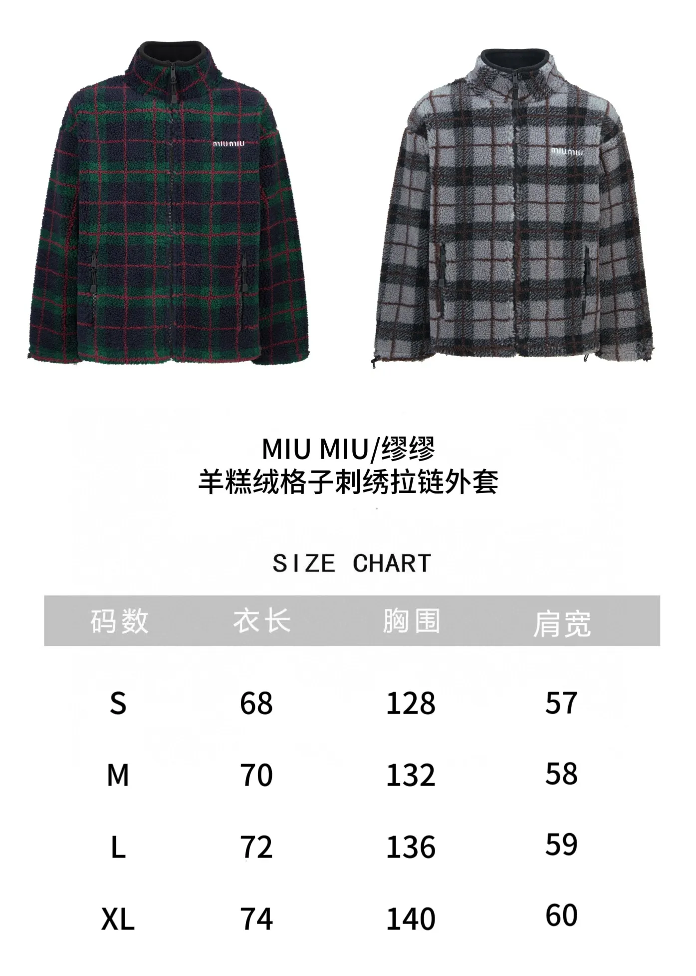 MiuMiu/缪缪 羊羔绒格子刺绣拉链外套